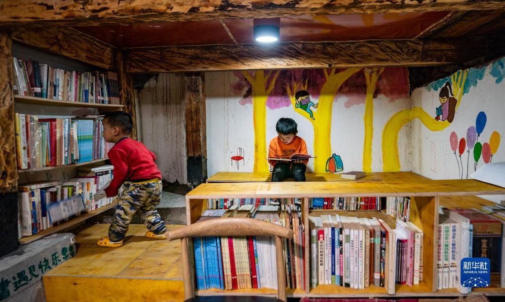 7月5日,秋那桶村的小朋友們在“半山花語(yǔ)”書(shū)屋選書(shū)、讀書(shū)。新華社記者 江文耀 攝
