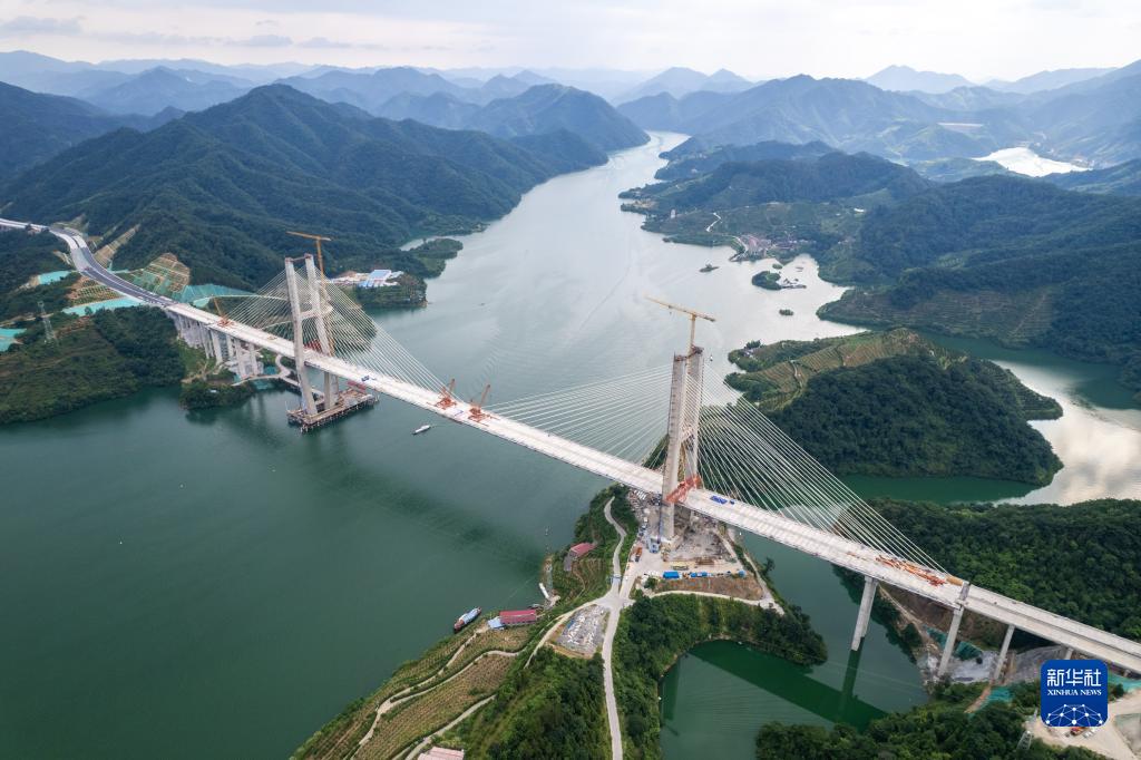 這是7月7日在湖南省益陽(yáng)市安化縣拍攝的官新高速雪峰湖大橋施工現場(chǎng)(無(wú)人機照片)。