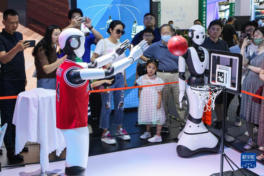 7月7日,機器人Ginger進(jìn)行投籃表演。