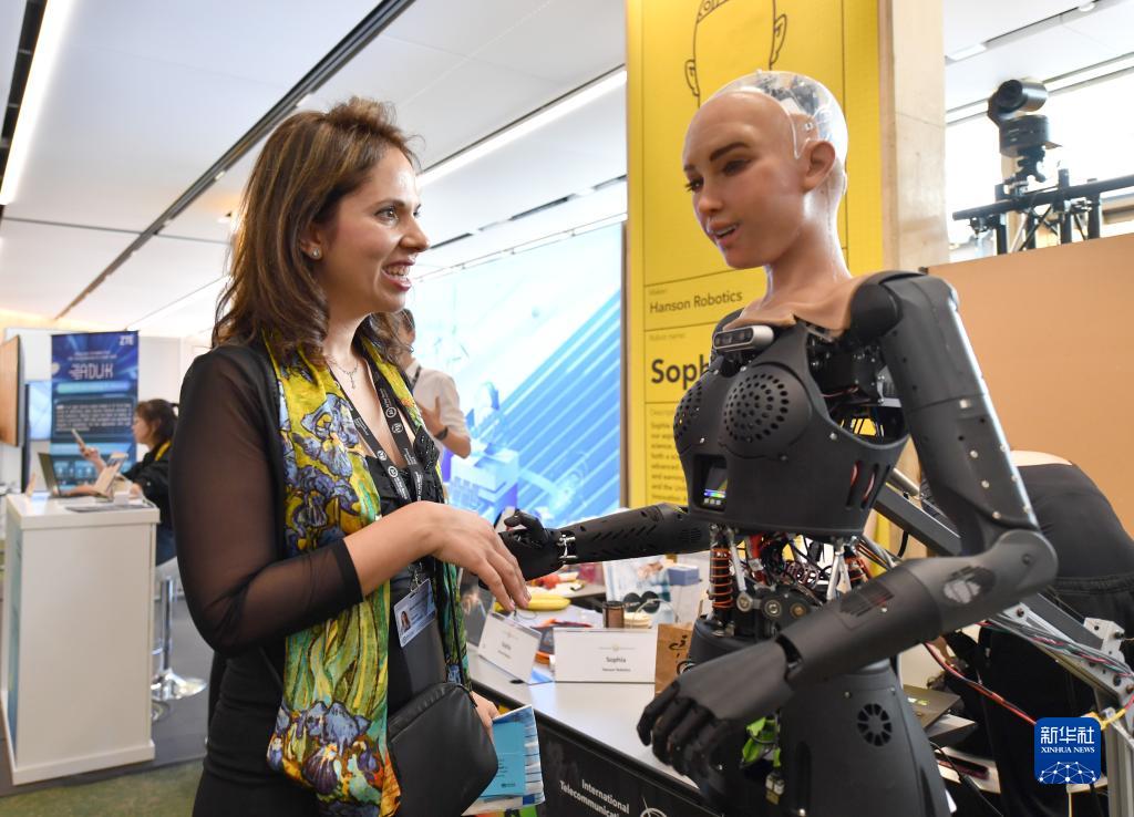 7月7日,在瑞士日內瓦“人工智能造福人類(lèi)全球峰會(huì )”上,一名參會(huì )者與仿真機器人索菲亞互動(dòng)。