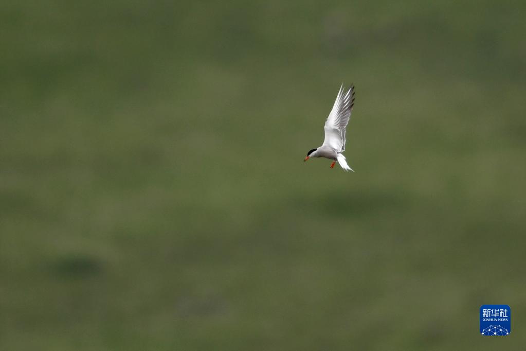 一只燕鷗在尕海濕地上飛翔(7月7日攝)。