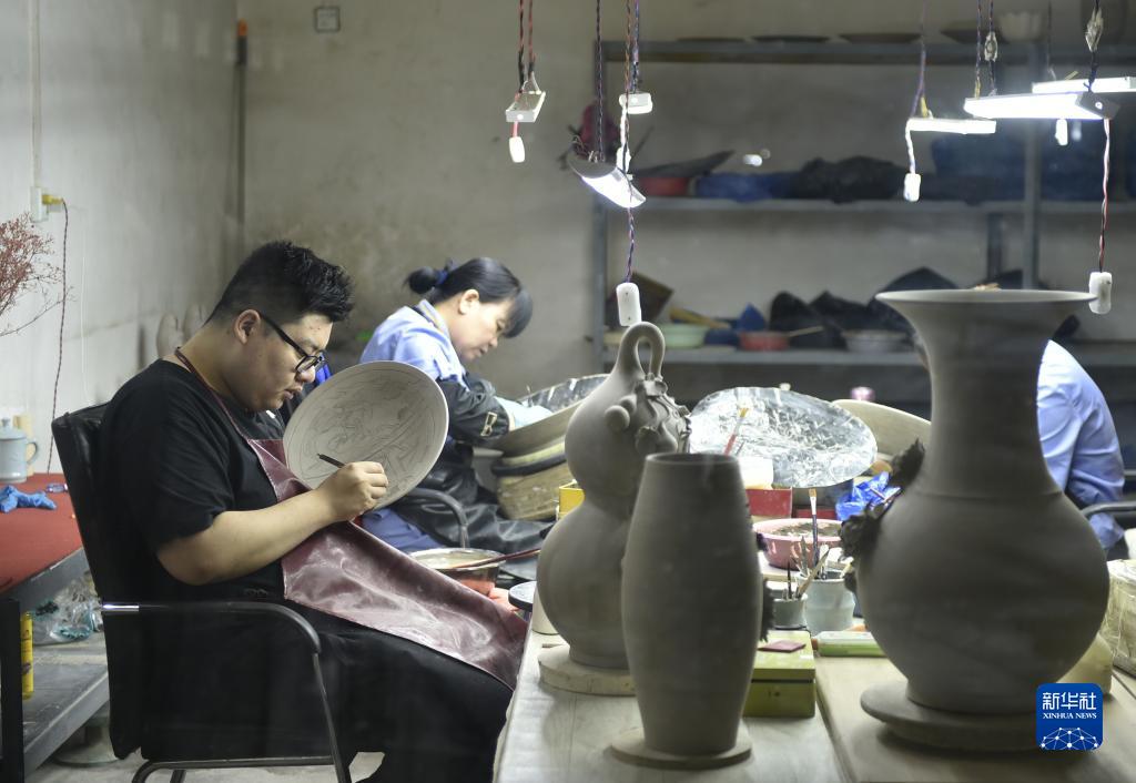 7月6日,工作人員在河南省汝州市玉松汝瓷有限公司的車(chē)間里制作汝瓷產(chǎn)品。