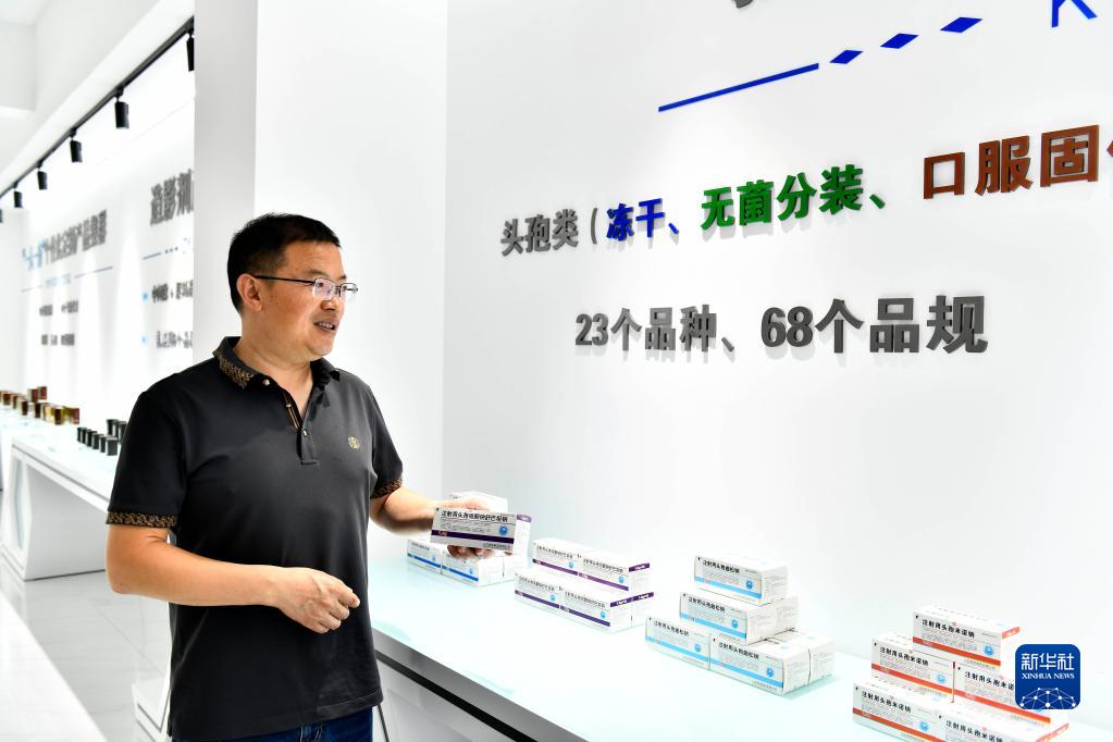 7月7日,在菏澤了未元生物醫藥大健康產(chǎn)業(yè)園展廳,工作人員介紹產(chǎn)業(yè)園醫藥產(chǎn)品生產(chǎn)情況。