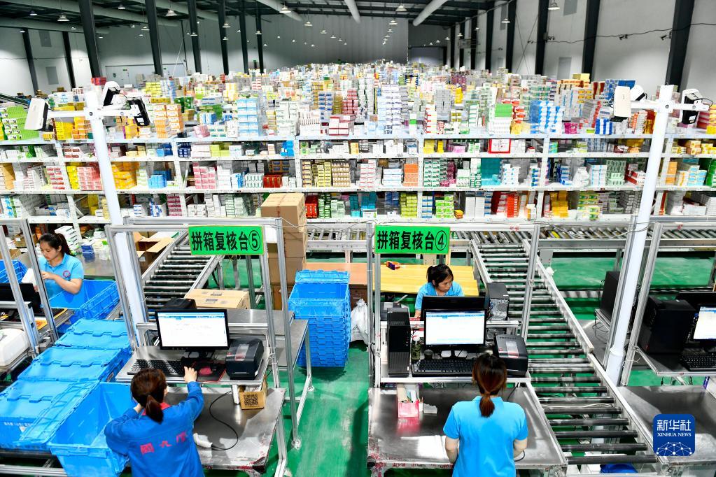 7月7日,在國九堂(山東)醫藥物流有限公司,工作人員按客戶(hù)需求準備藥品。