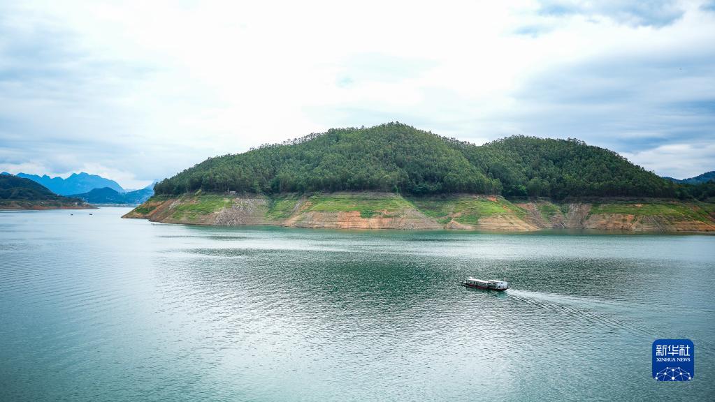 船只行駛在萬(wàn)峰湖南盤(pán)江鎮水域(7月5日攝)。