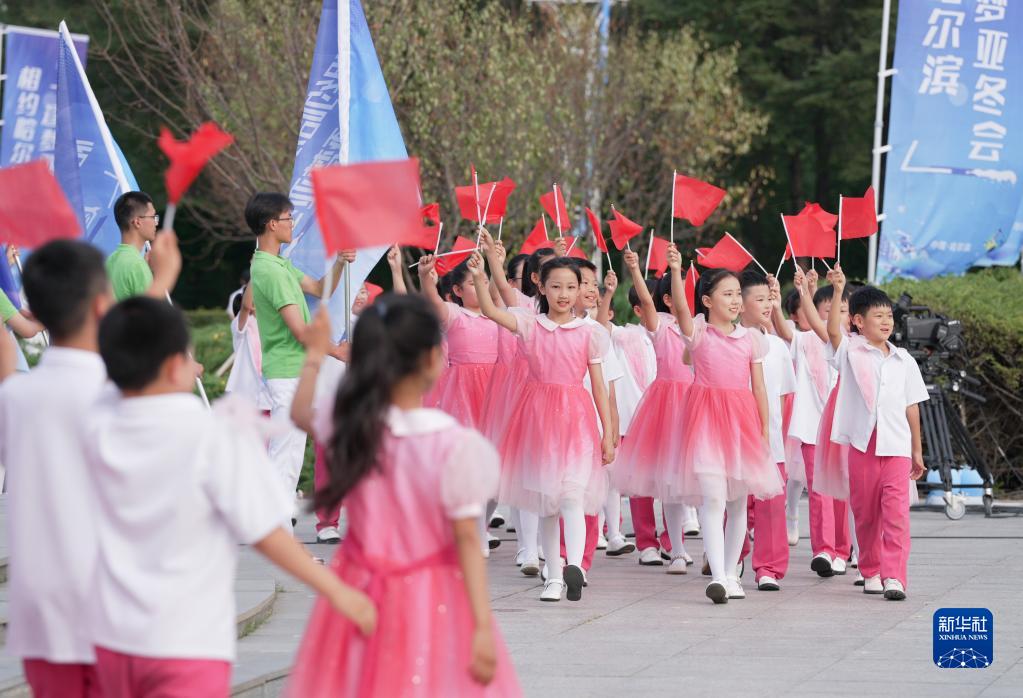 7月8日,在哈爾濱市太陽(yáng)島景區太陽(yáng)石廣場(chǎng),演職人員慶祝哈爾濱市獲得2025年第九屆亞洲冬季運動(dòng)會(huì )舉辦權。