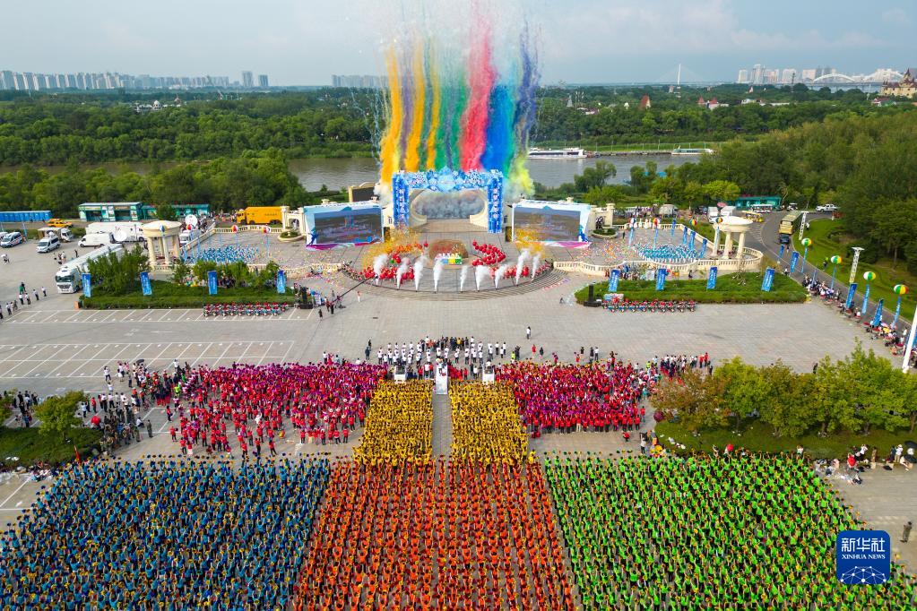 這是7月8日拍攝的在哈爾濱市太陽(yáng)島景區太陽(yáng)石廣場(chǎng)舉行的慶祝儀式現場(chǎng)(無(wú)人機照片)。