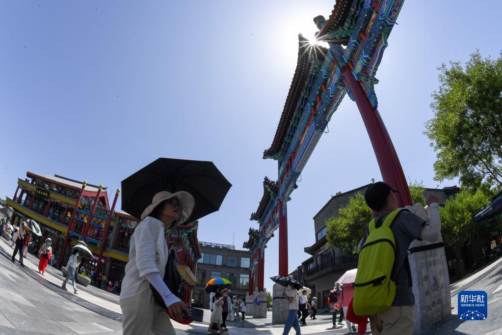 7月6日,游客走在北京市前門(mén)大街上。當日,北京市氣象臺7時(shí)升級發(fā)布高溫紅色預警信號,這也是今年北京市氣象臺發(fā)布的第二個(gè)高溫紅色預警。
