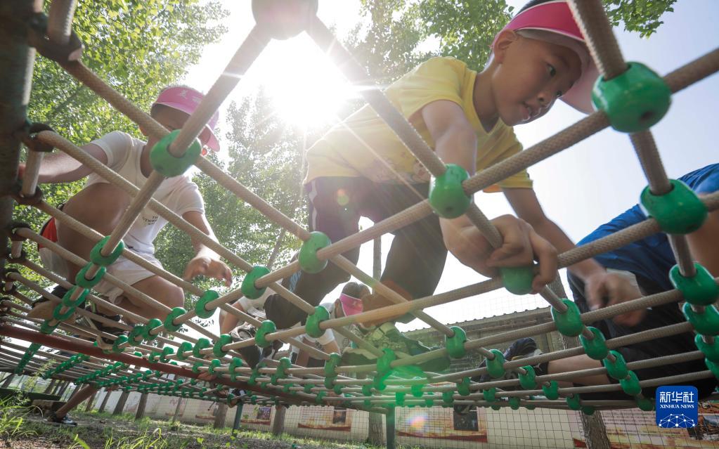 7月8日,參加少年夏令營(yíng)的孩子在河北省遵化市小廠(chǎng)鄉的訓練營(yíng)地進(jìn)行穿越障礙訓練。