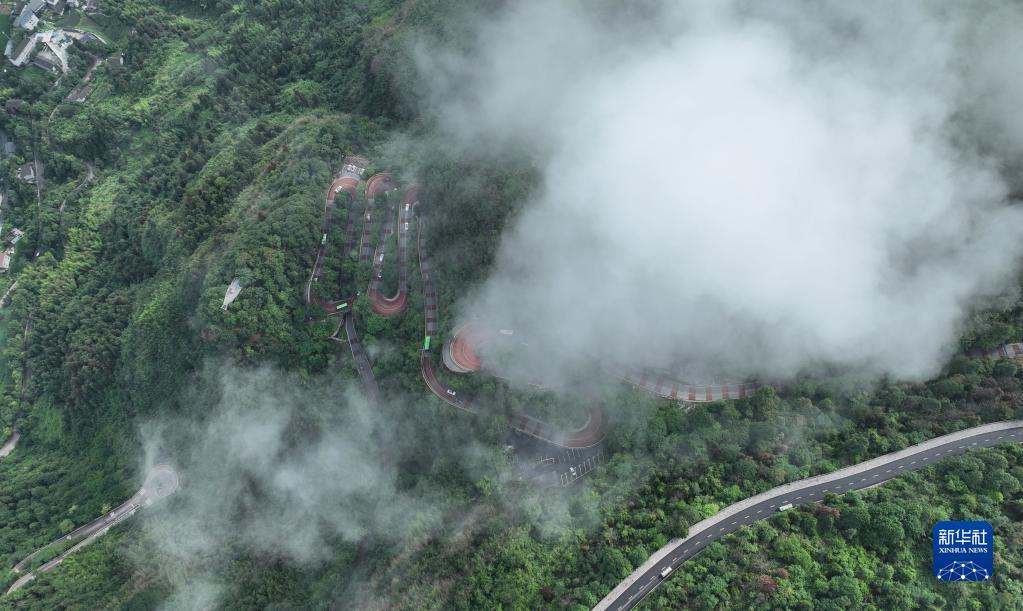 7月8日,雨過(guò)天晴后的湖南省湘西土家族苗族自治州吉首市矮寨特大懸索橋和矮寨盤(pán)山公路云霧繚繞,景色秀美。