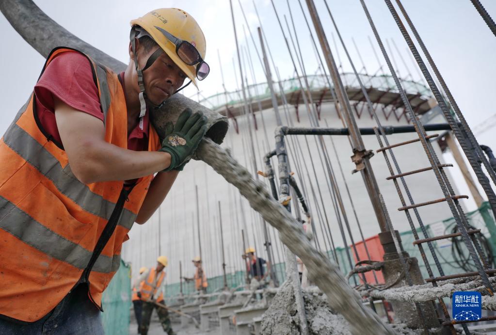 7月8日,工人在糧食安全應急儲備及食品深加工全鏈化綜合生產(chǎn)基地項目建設工地施工。
