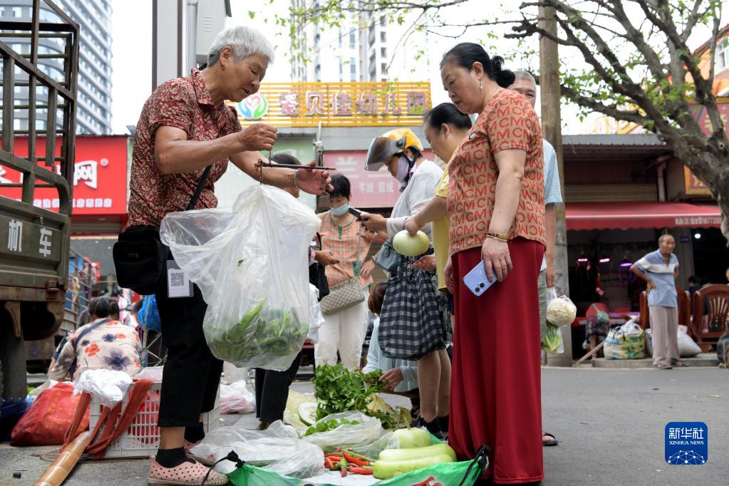 在江西南昌縣城區某菜市場(chǎng)附近,菜農余春蘭(左)為購買(mǎi)紅薯葉的顧客稱(chēng)重(7月5日攝)。
