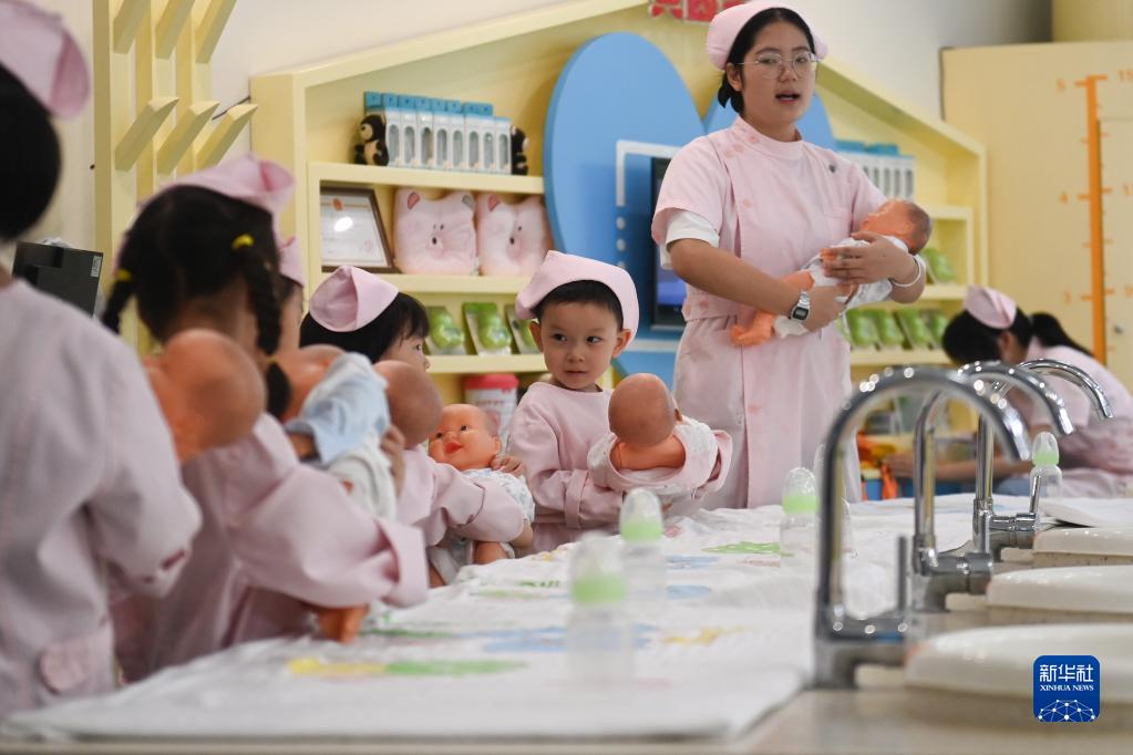 7月9日,小朋友在體驗“新生兒”護理。