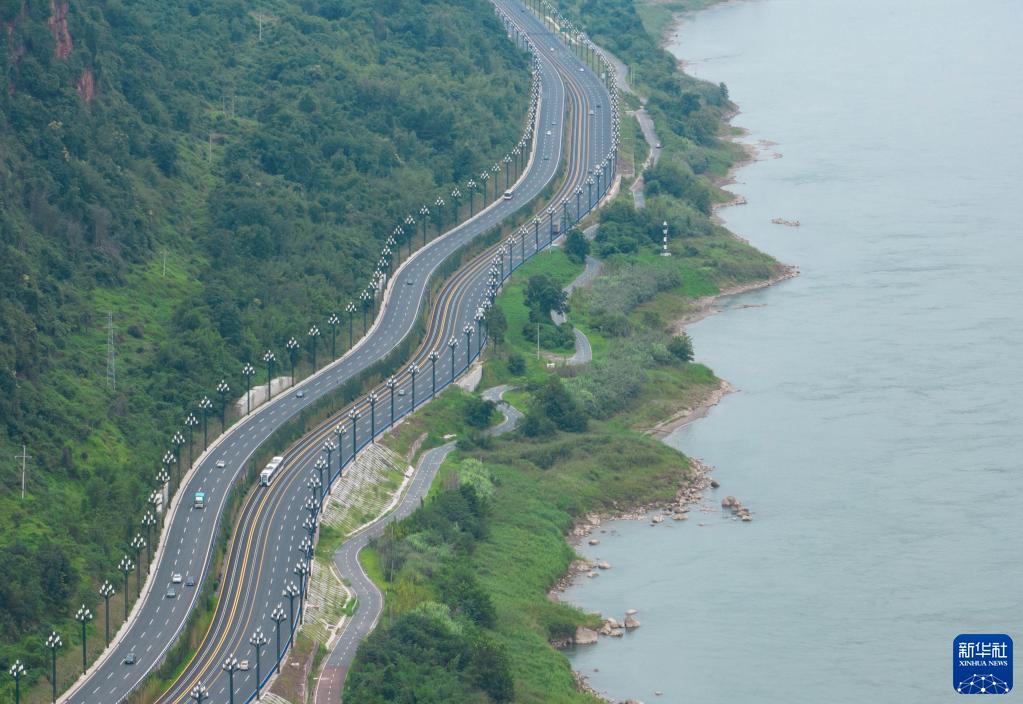 這是6月29日在四川省宜賓市拍攝的三江新區通往南溪區的智能軌道快運系統T4線(xiàn),該線(xiàn)沿著(zhù)長(cháng)江邊運行(無(wú)人機照片)。