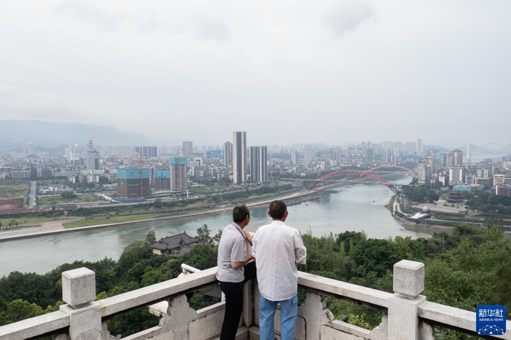 市民從白塔山俯瞰四川省宜賓市三江口(6月29日攝,無(wú)人機照片)。