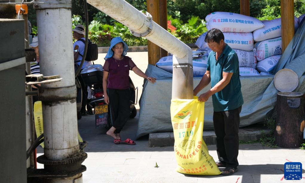 7月10日,毛納村村民將稻谷裝袋。