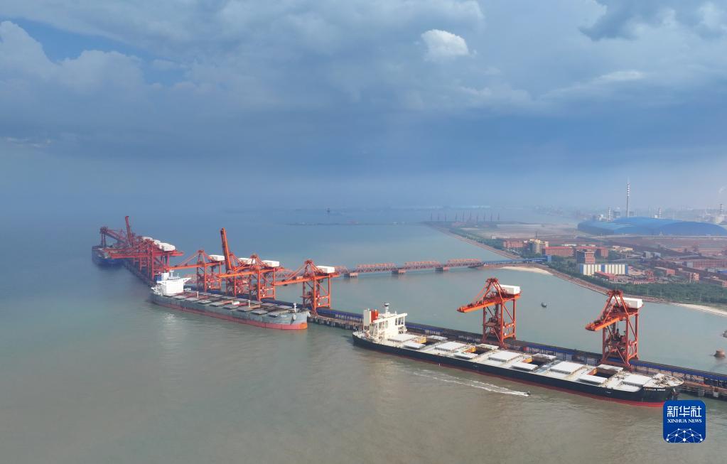 7月10日,多艘輪船靠泊在唐山港曹妃甸港區礦石碼頭卸載(無(wú)人機照片)。