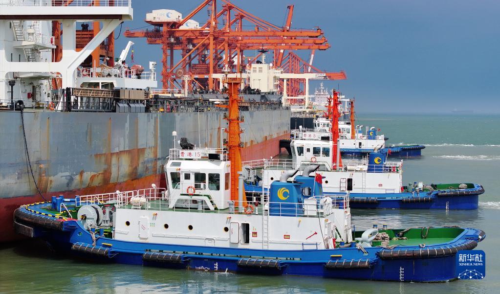 7月10日,一艘輪船在唐山港曹妃甸港區礦石碼頭卸載后在拖輪協(xié)助下離港(無(wú)人機照片)。