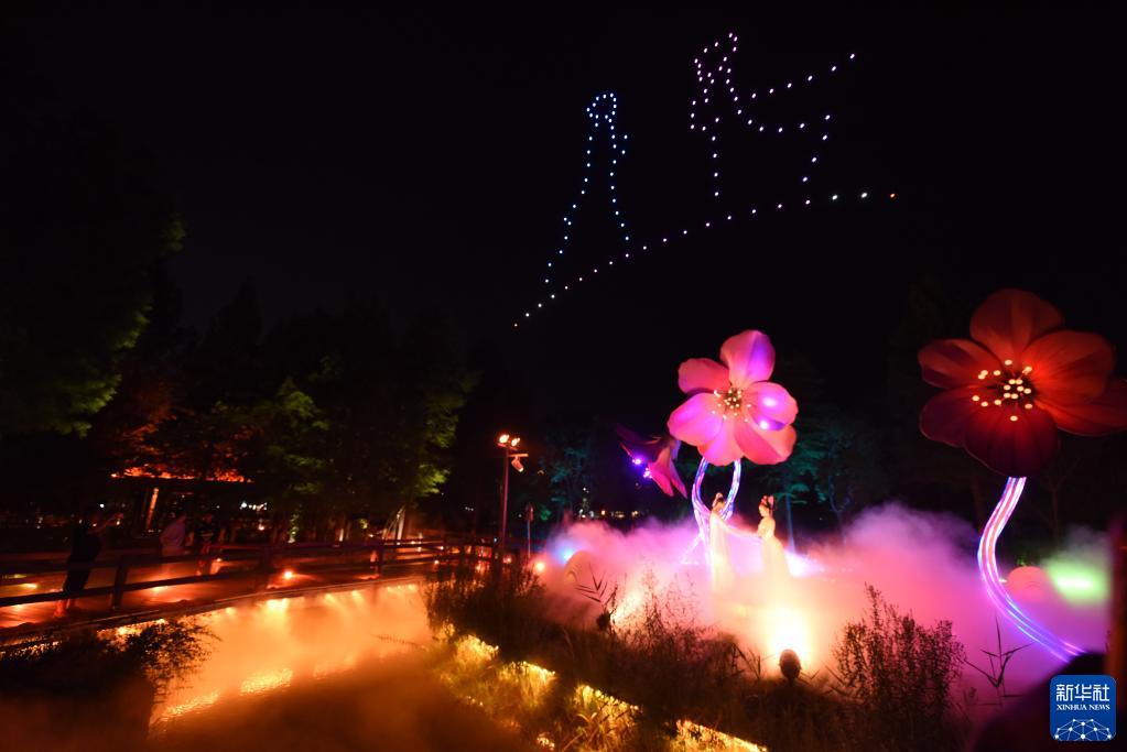 7月9日,在江蘇東臺西溪天仙緣景區,觀(guān)眾在觀(guān)看行進(jìn)式夜間游園演出《尋仙緣》。