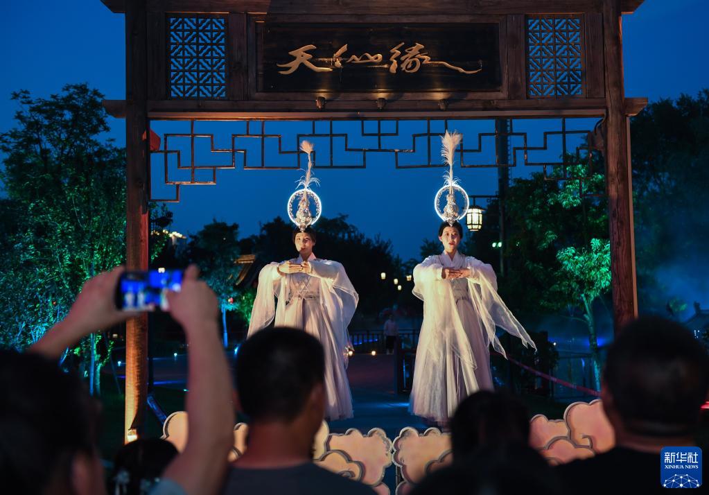 7月9日,在江蘇東臺西溪天仙緣景區,觀(guān)眾在觀(guān)看行進(jìn)式夜間游園演出《尋仙緣》。