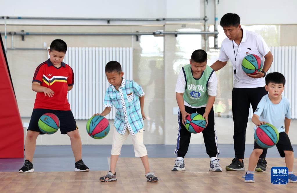 7月10日,在河北省石家莊市復興大街小學(xué),小學(xué)生在老師的指導下練習籃球基本功。