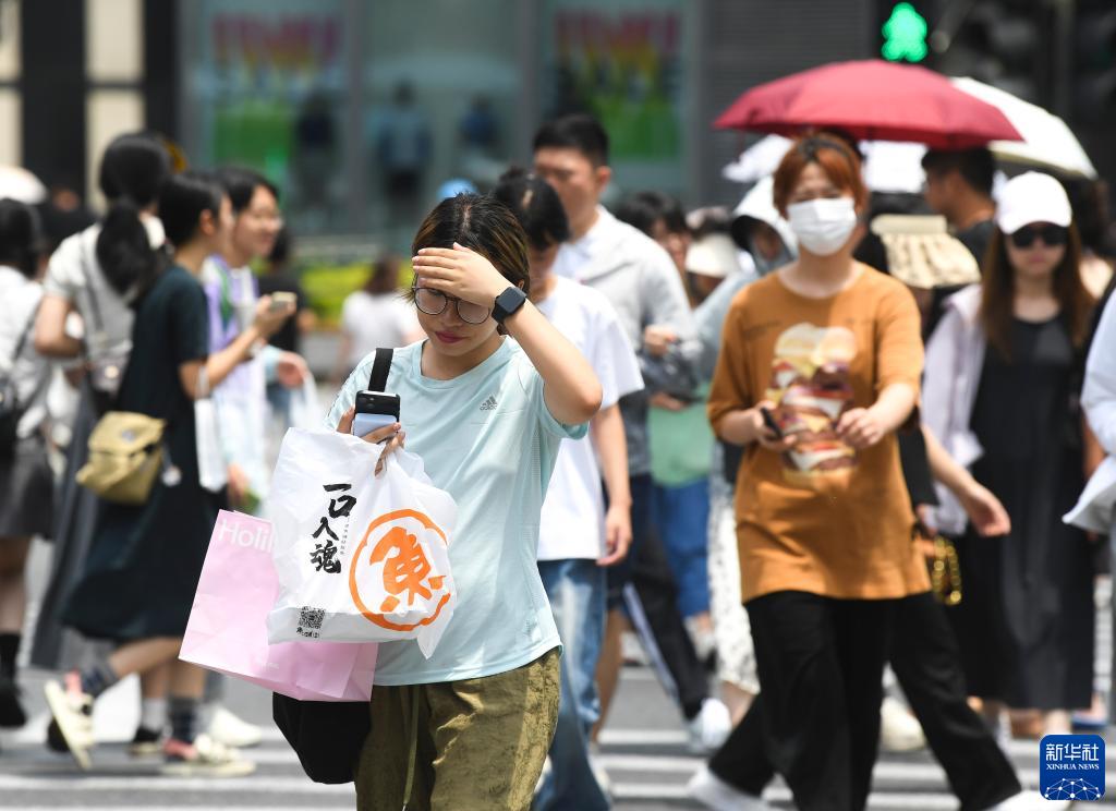 7月10日,行人在杭州湖濱商圈過(guò)馬路。