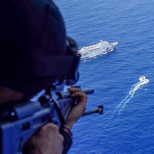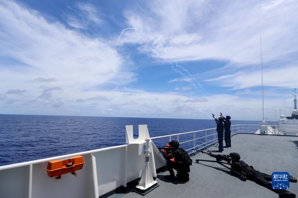 7月10日,中國海軍“和平方舟”號醫院船在太平洋上組織反恐反海盜演練。這是隨船火力組發(fā)射信號彈警告“海盜艇”。