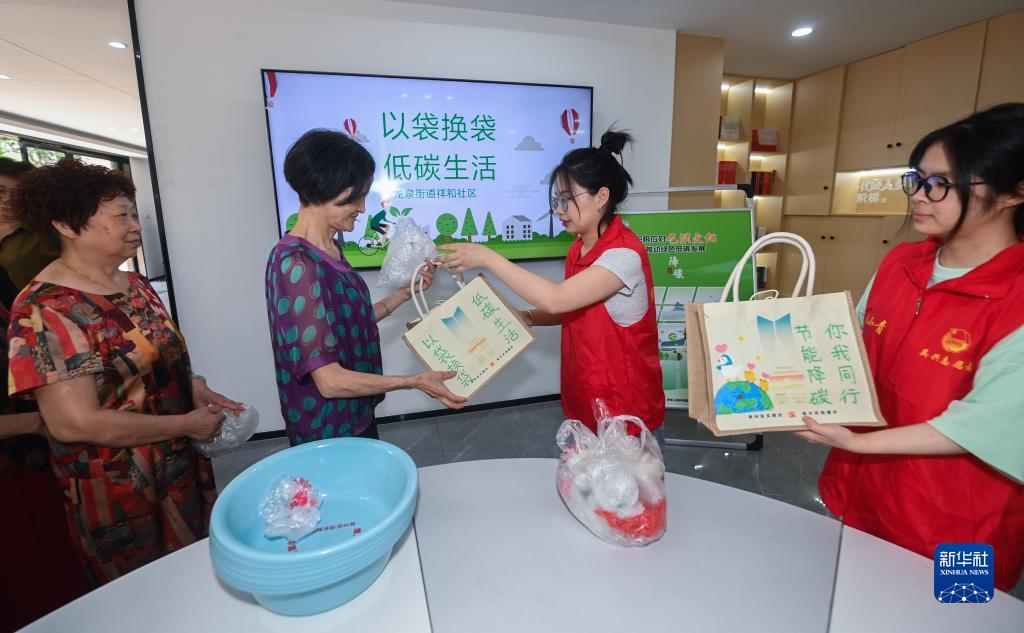 7月11日,浙江省湖州市吳興區龍泉街道祥和社區開(kāi)展“以袋換袋”低碳主題活動(dòng),鼓勵居民把家中的一次性塑料袋換取可以重復使用的環(huán)保袋。