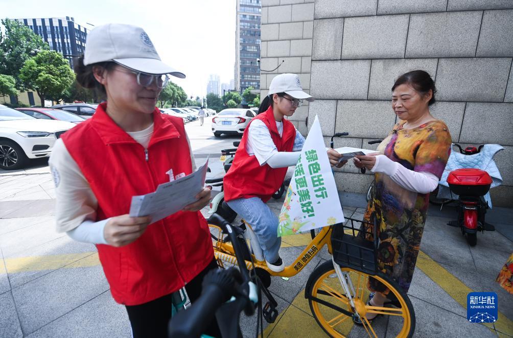 7月11日,低碳騎行的青年志愿者們給居民發(fā)放低碳日主題宣傳資料及問(wèn)卷,倡導綠色出行。
