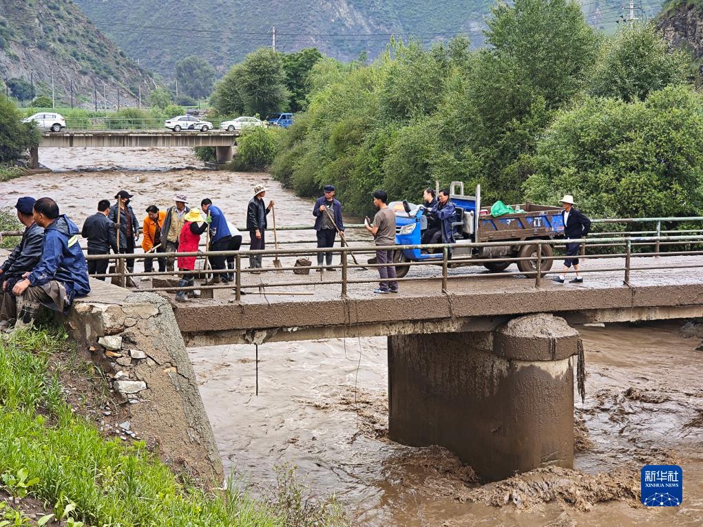 7月11日,在甘肅省甘南藏族自治州夏河縣麻當鎮,當地組織力量進(jìn)行清淤。