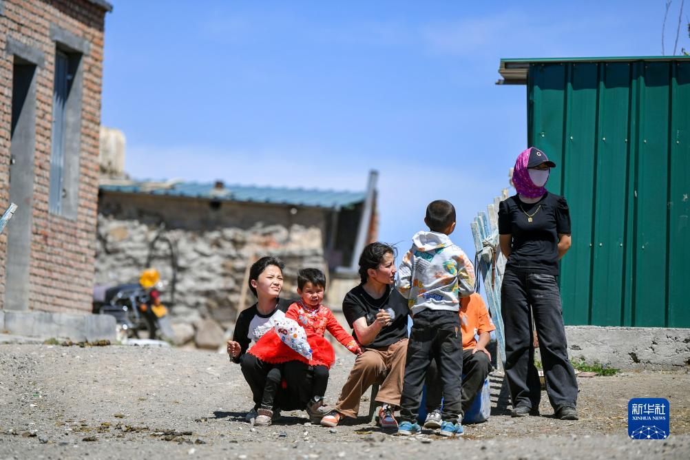 哈布得拉什么趕著(zhù)羊群離家后,他的大女兒加孜拉(右一)、小女兒昆樹(shù)阿克(左三)和侄女(左一)、孫輩們齊齊望著(zhù)轉場(chǎng)人群遠去的方向(7月3日攝)。