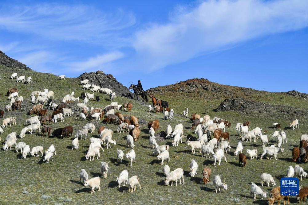 哈布得拉什么趕著(zhù)羊群在轉場(chǎng)牧道上行進(jìn)(7月3日攝)。