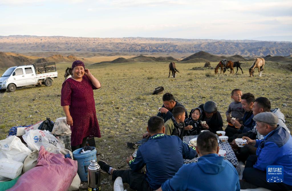 轉場(chǎng)隊伍抵達第一天的露宿營(yíng)地后,巴哈提(左)帶著(zhù)物品和當日晚餐如約趕到(7月3日攝)。