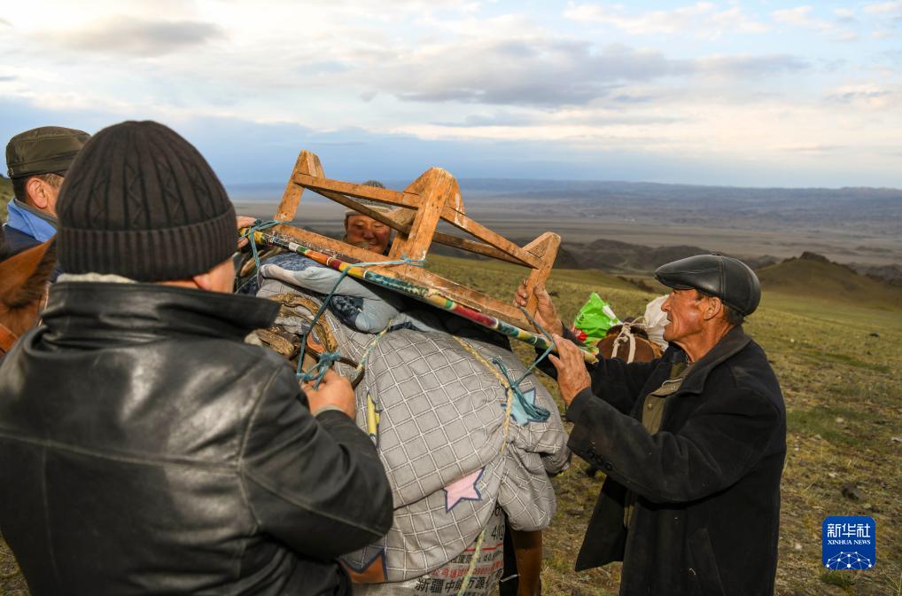 轉場(chǎng)第二天清晨,哈布得拉什么(右)和家人把轉場(chǎng)物品綁到馬背上,向夏牧場(chǎng)繼續前進(jìn)(7月4日攝)。