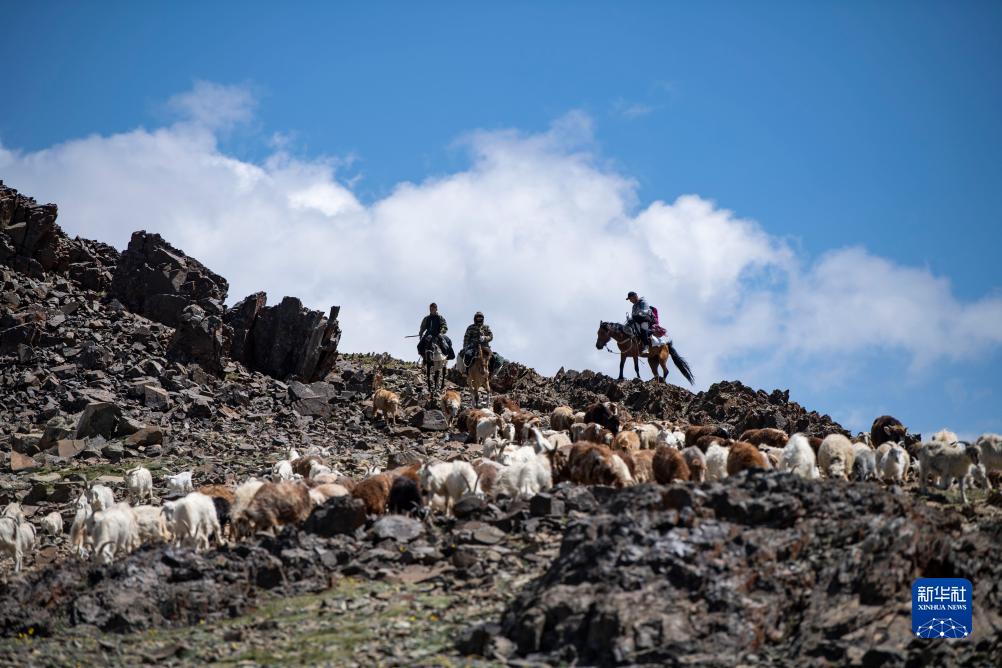 轉場(chǎng)隊伍翻越一處山坡,向夏牧場(chǎng)前進(jìn)(7月4日攝)。