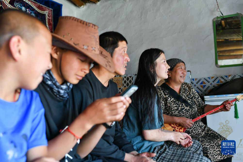 巴哈提(右一)和孩子們在家唱歌、聊天(7月6日攝)。
