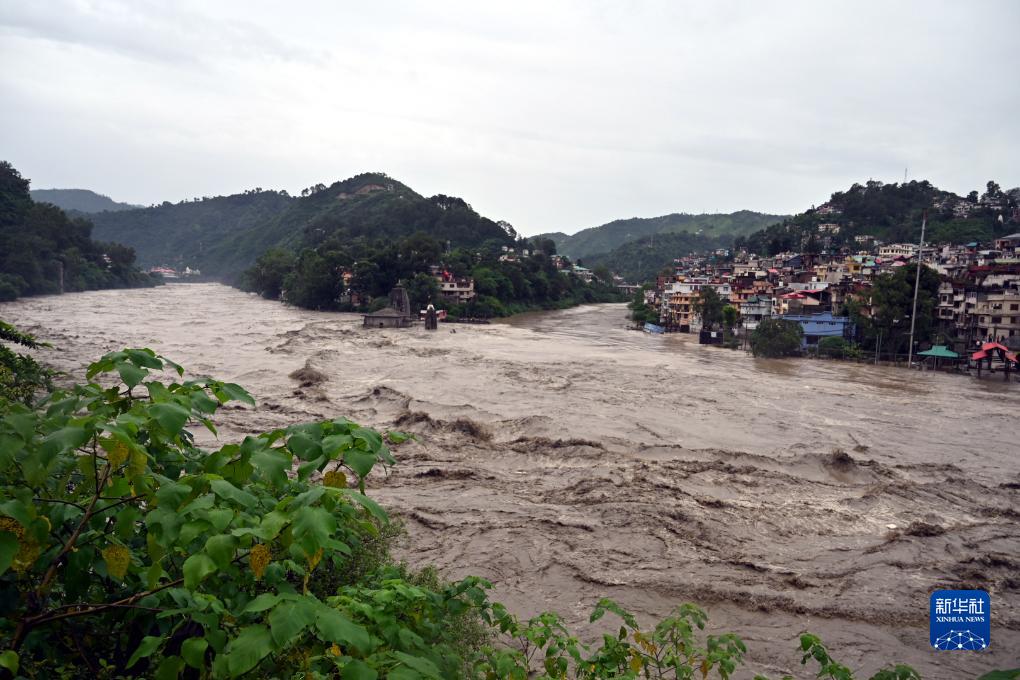 這是7月10日在印度喜馬偕爾邦曼迪地區拍攝的漲水的比亞斯河。