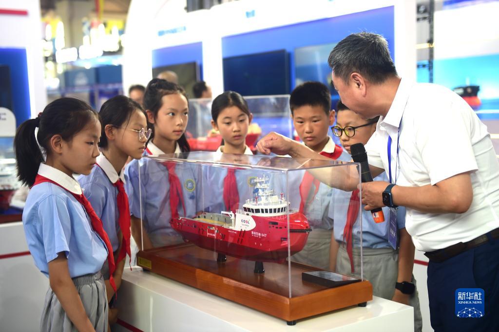 7月11日,滄州市實(shí)驗小學(xué)學(xué)生在2023年航??萍疾┯[會(huì )上了解中海油田服務(wù)股份有限公司的新型船舶。