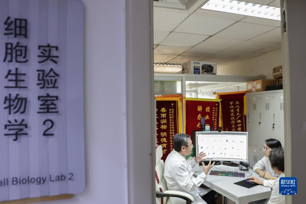 6月30日,黃曉軍(左)和青年骨干在北京大學(xué)血液病研究所討論工作。