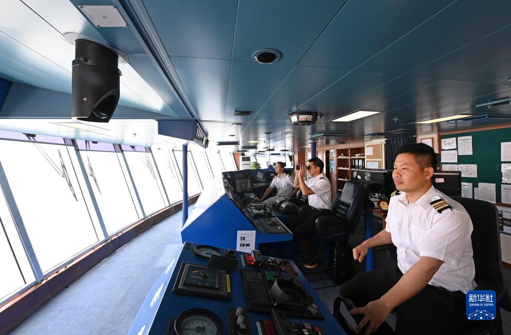 7月11日,天津東方國際郵輪有限公司旗下“夢(mèng)想”號郵輪工作人員在駕駛室內值班。