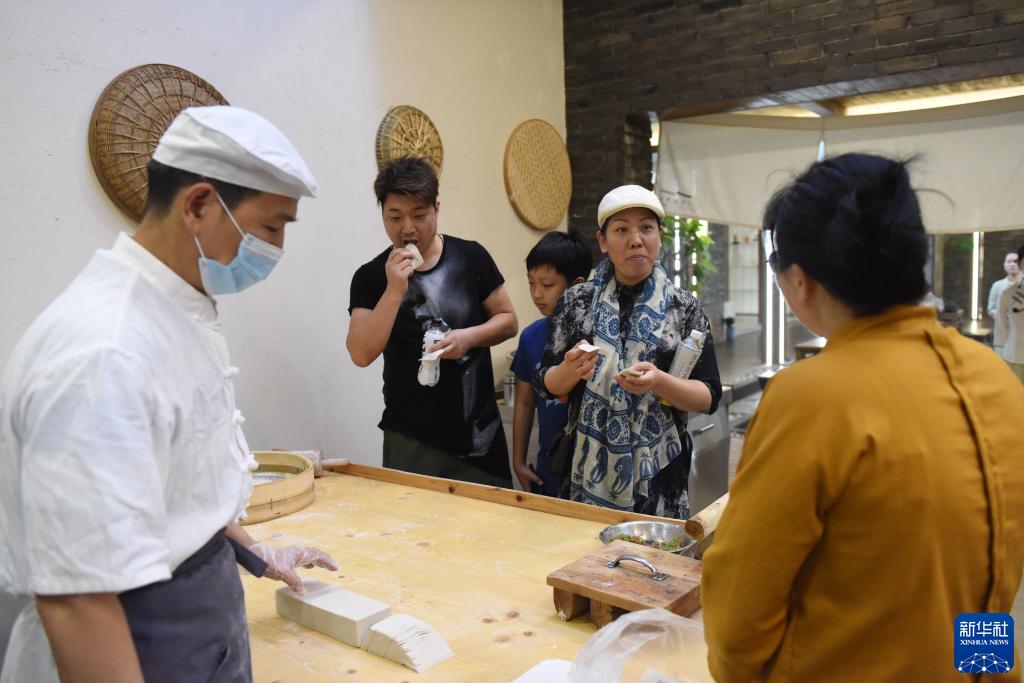 7月11日,游客在穆溝古村品嘗特產(chǎn)“阜寧大糕”。