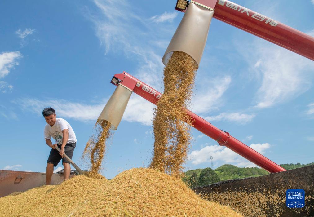 7月10日,在湖南省永州市道縣四馬橋鎮金獅庵村,農民把收割的早稻裝車(chē)。