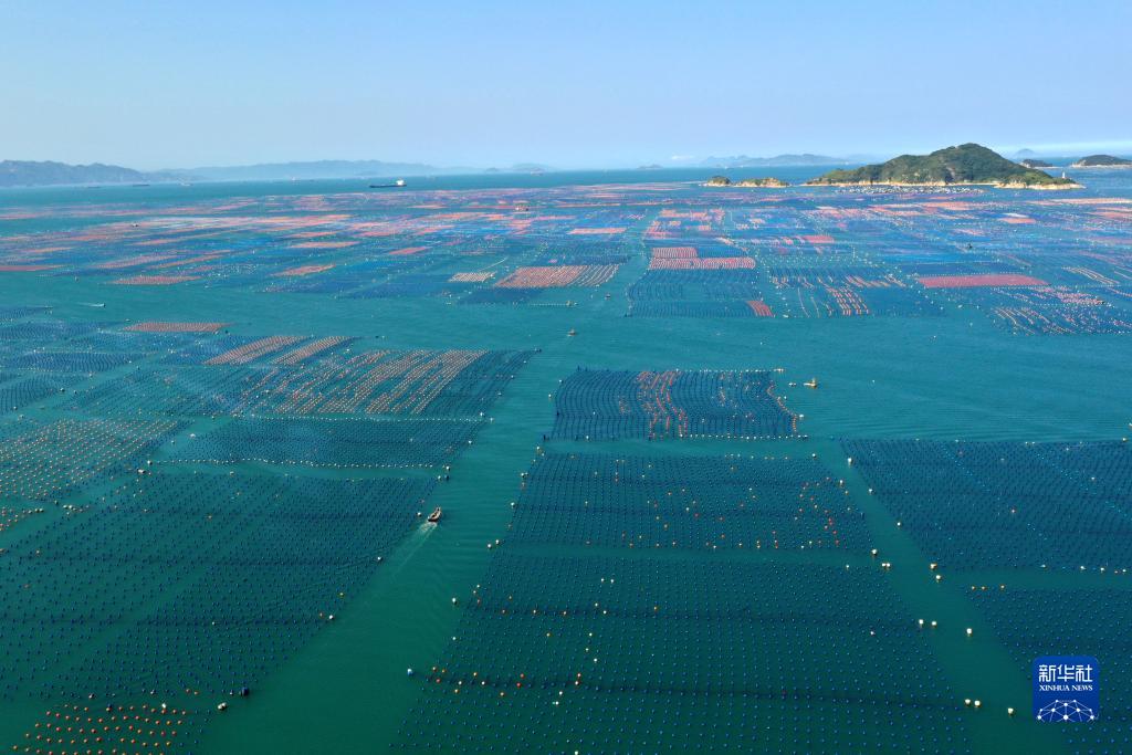 7月11日,在連江縣下宮鎮松蘆灣海域,漁民駕駛漁船穿梭在海上牧場(chǎng)(無(wú)人機照片)。