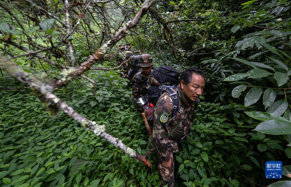 7月8日,何貴品(前)帶領(lǐng)巡護隊在高黎貢山國家級自然保護區中行進(jìn)。新華社記者 費茂華 攝