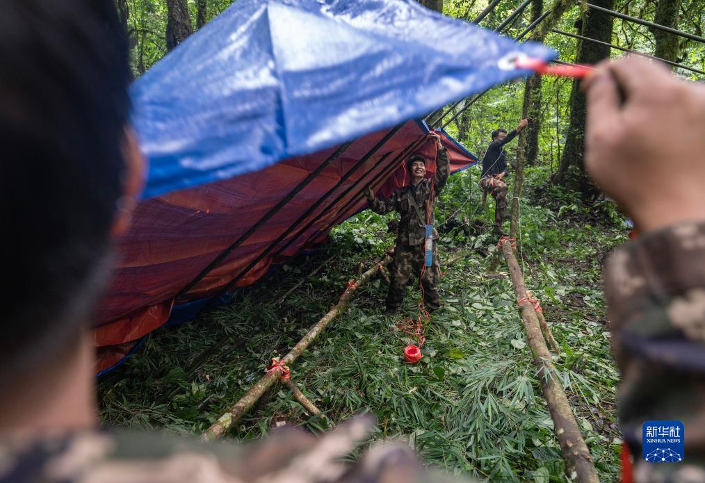 7月8日,巡護隊員在高黎貢山國家自然保護區搭棚子。新華社記者 費茂華 攝