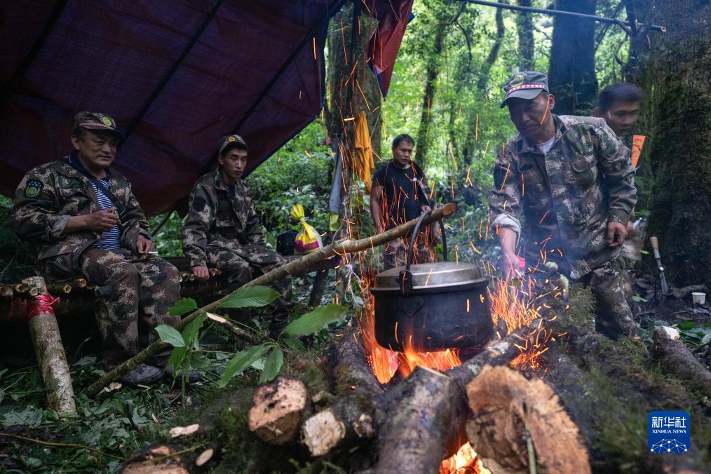 7月8日,在高黎貢山國家自然保護區,巡護隊員圍在篝火旁做飯并烤干濕衣服。新華社記者 費茂華 攝