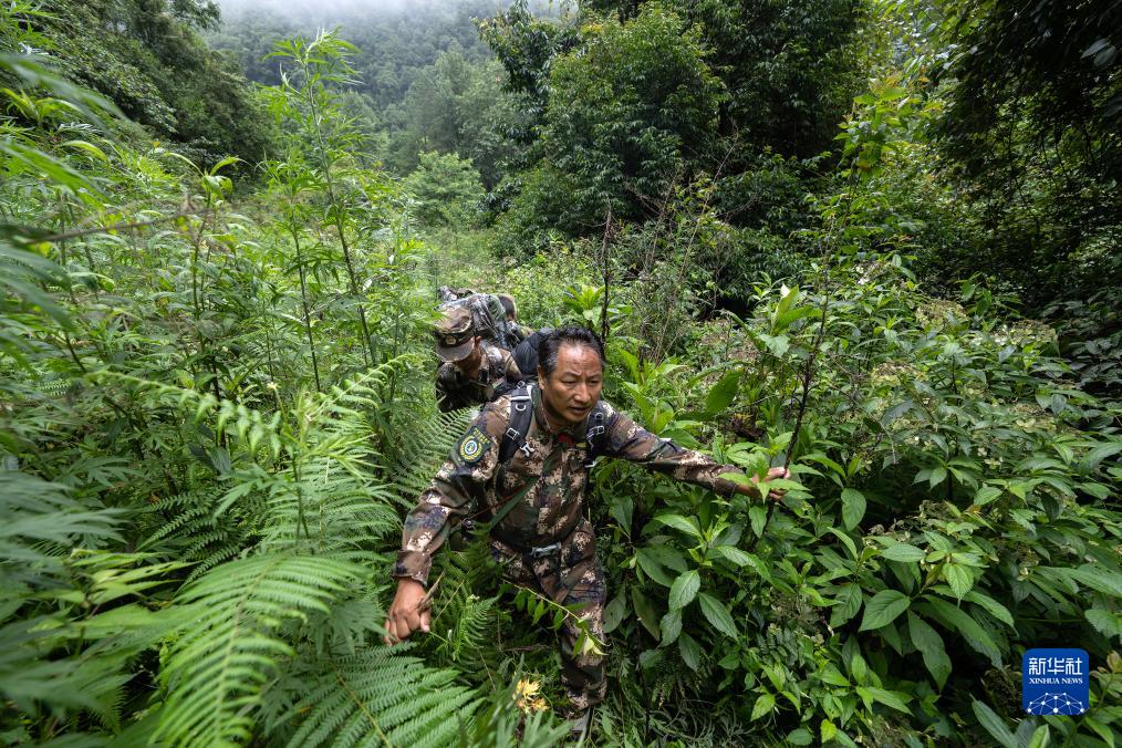 7月8日,何貴品(前)帶領(lǐng)巡護隊在高黎貢山國家級自然保護區中行進(jìn)。新華社記者 費茂華 攝