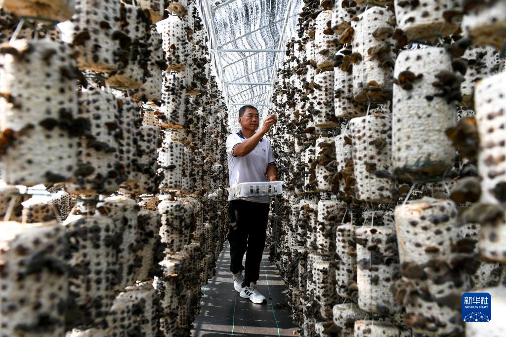 7月11日,在內蒙古扎蘭屯市扎蘭屯黑木耳產(chǎn)業(yè)孵化園區內,工作人員在采摘黑木耳。