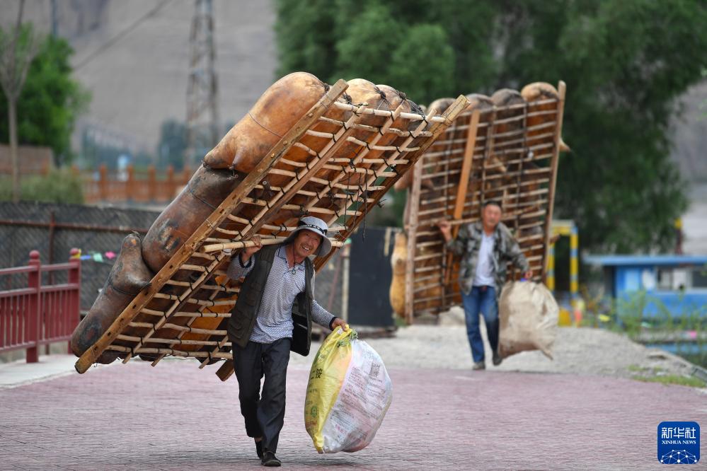 兩名筏子客在黃河石林景區背著(zhù)羊皮筏子準備漂流(7月11日攝)。