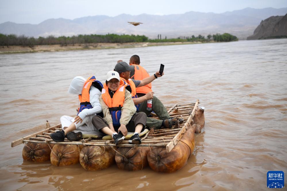 游客在黃河石林景區體驗羊皮筏子漂流(7月11日攝)。